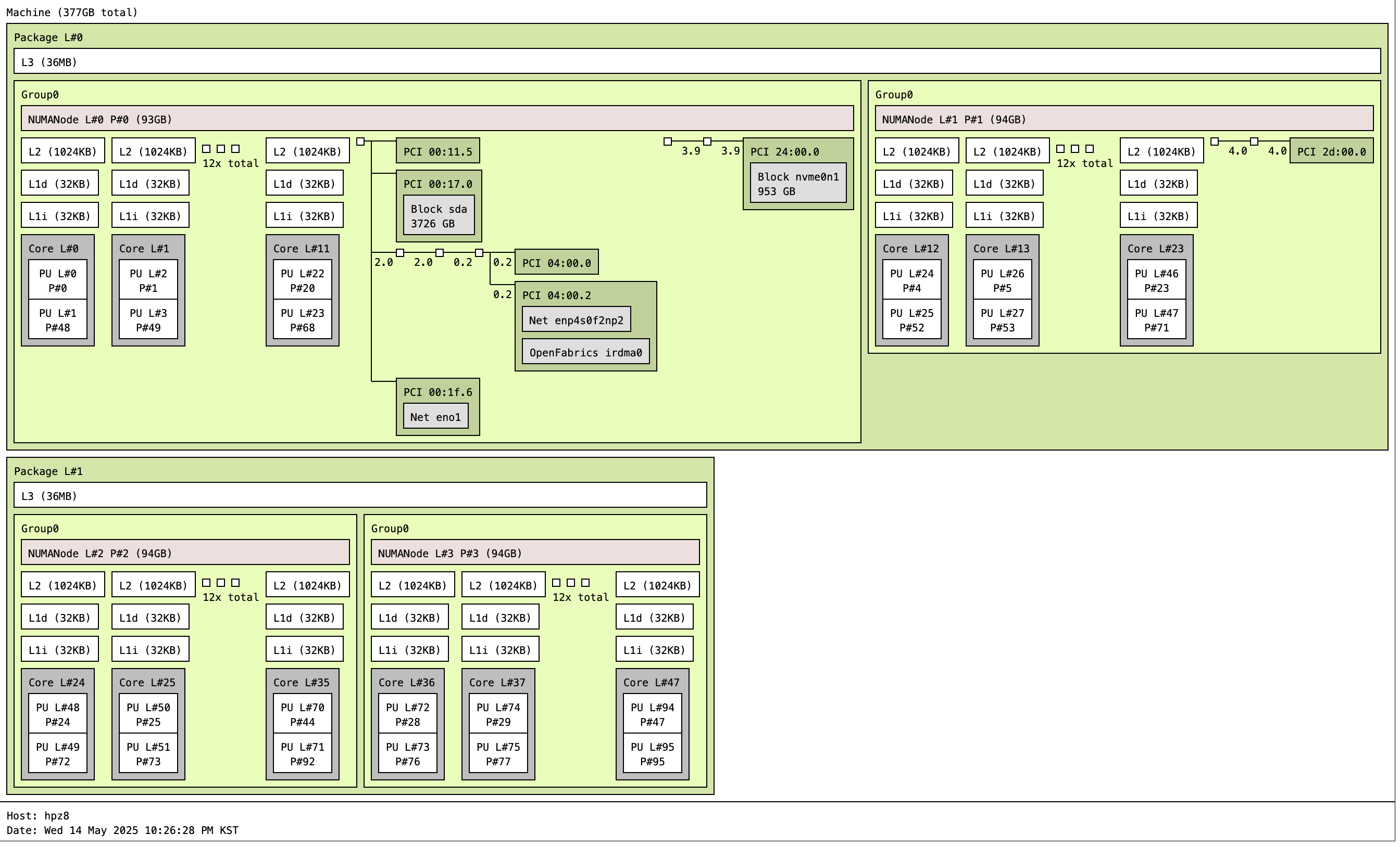 위의 topology를 보면, 물리코어 (L#0)에는 논리코어 (P#0, P#48)이 할당되어 있다.