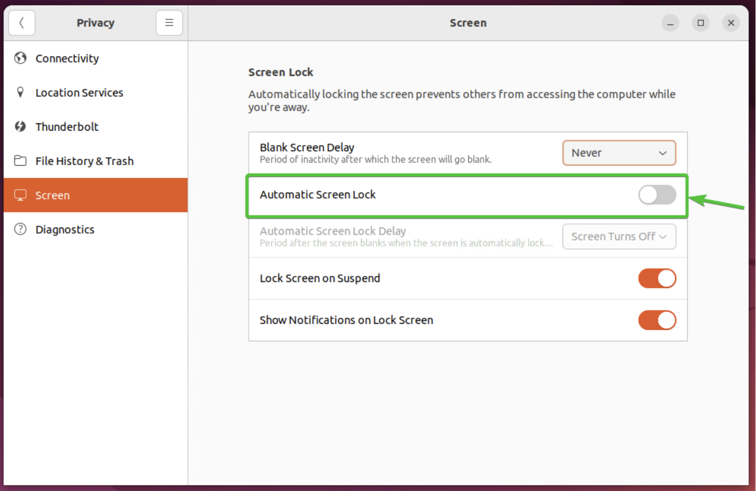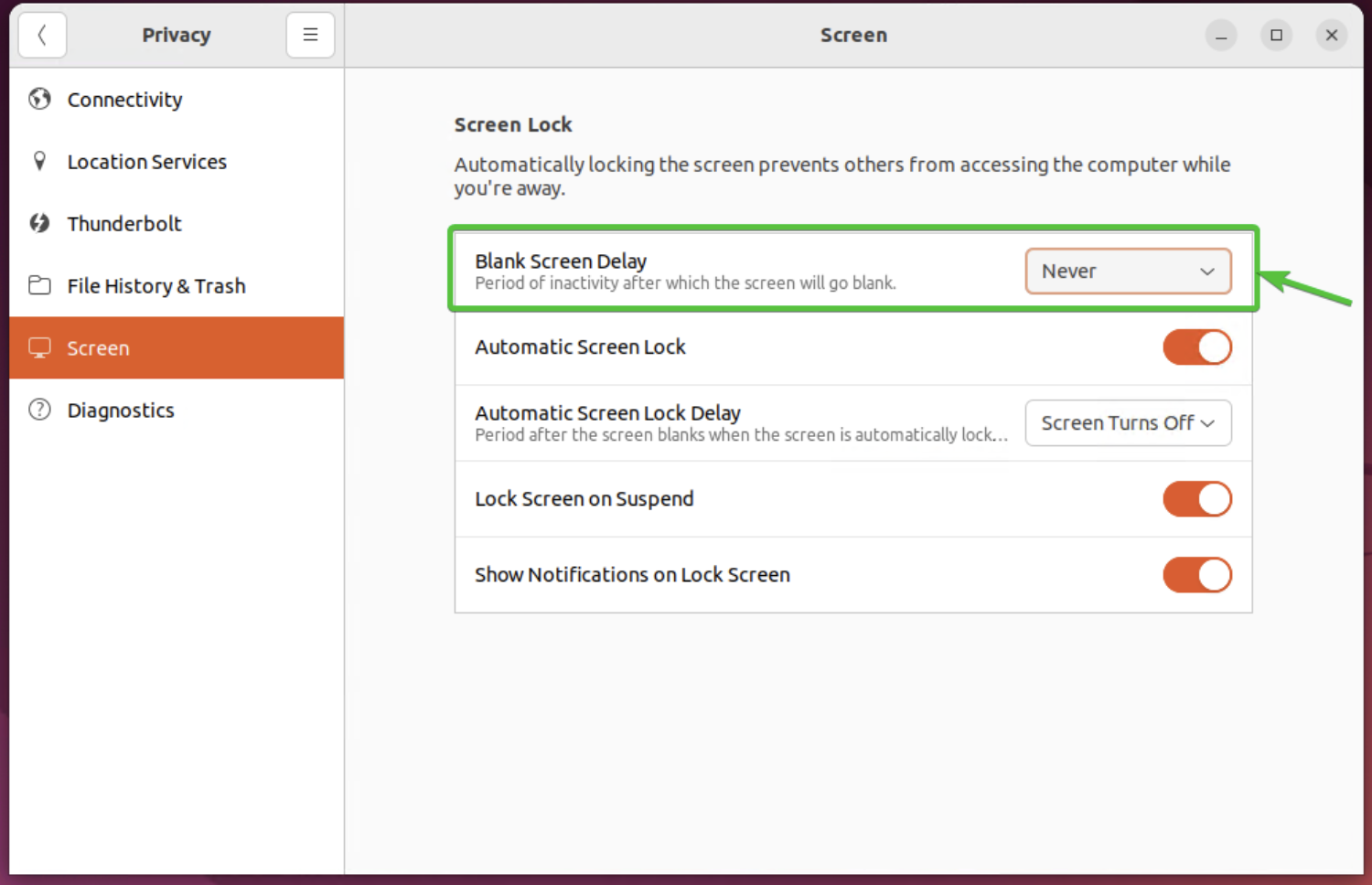 Screen Blanking과 자동 Screen lock 기능을 끈다