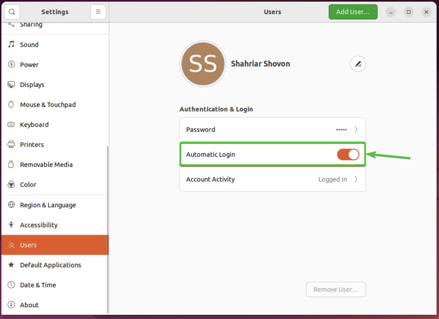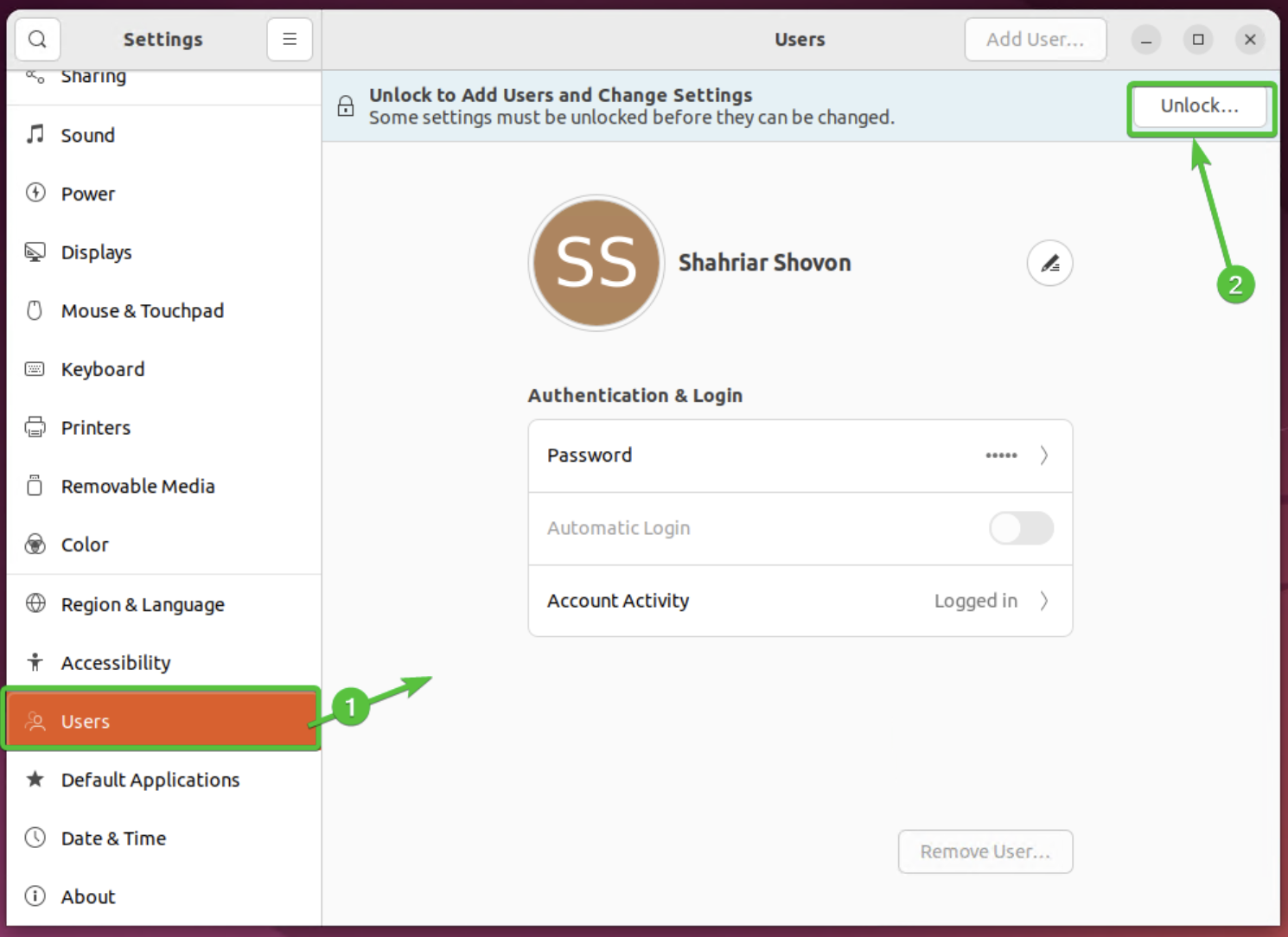 Settings에서 Users Unlock